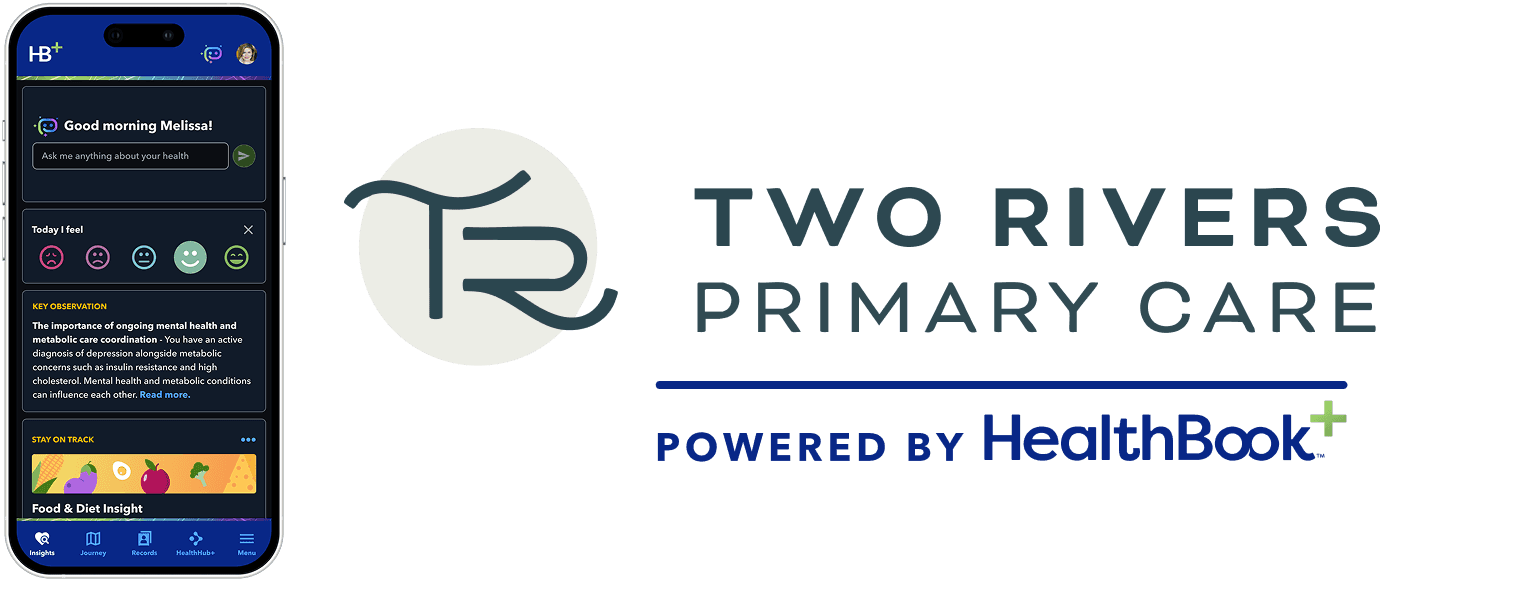 Two Rivers Primary Care has partnered with HealthBook+ to give you a more connected, personalized care experience—making it easier to manage and improve your health.